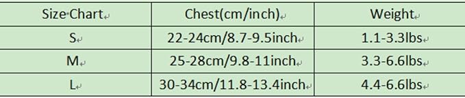 - Size Chart: Small - Chest 8.7-9.5inch, suitable for 1.1-3.3lbs. Medium - Chest 9.8-11inch, suitable for 3.3-6.6lbs. Large - Chest 11.8-13.4inch, suitable for 4.4-6.6lbs. Pls check the size before you buy it.