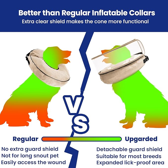 - Helps the Healing Process: While wearing a dog cone collar may affect your dog's comfort, the dog inflatable neck collar offers a more pleasant experience compared to traditional plastic cones. Its rounded design creates a barrier that prevents your pet from aggravating his/her wounds. Similar to an inflatable neck pillow, it doesn't block your dog's vision and minimizes discomfort. Plus, if your dog bumps into something, there’s no frightening noise, making the healing process less stressful