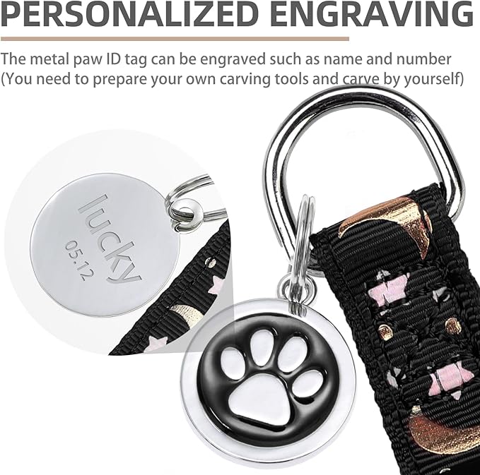 - [Cute ID Tag for DIY] - Each harness is equipped with a metal ID tag, and the front is a cute paw pattern, while on the back, you can engrave whatever you want, such as the dog's name and so on. It does not corrode as easily as wooden labels and is durable. You can also remove it when washing the harness.