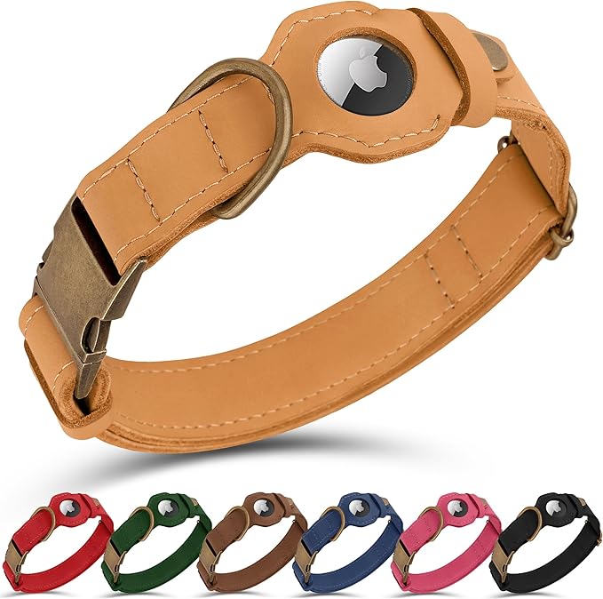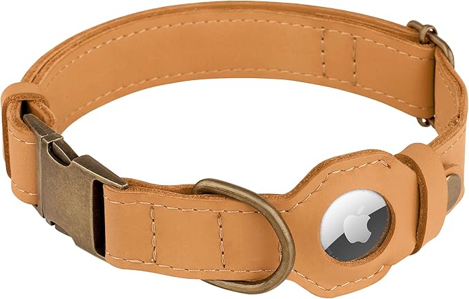 AirTag Dog Collar - Genuine Leather Dog Collar with Apple AirTag Holder and Metal Buckle - Smart GPS Tracking Pet Collars for Small Medium Large Dogs Puppy (Light Brown, M, 14"-18" Neck Fit)