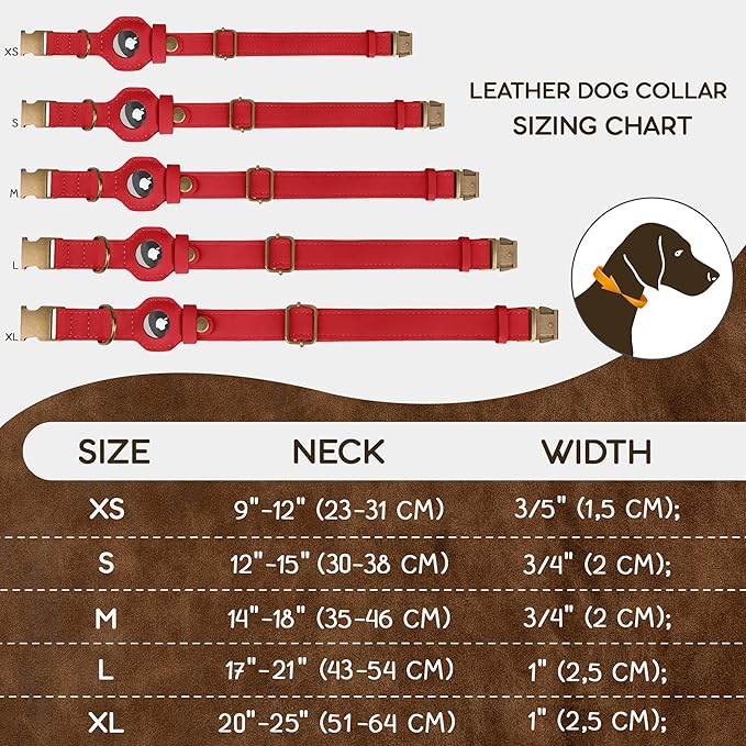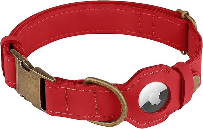 AirTag Dog Collar - Genuine Leather Dog Collar with Apple AirTag Holder and Metal Buckle - Smart GPS Tracking Pet Collars for Small Medium Large Dogs Puppy (Red, XL, 20"-25" Neck Fit)