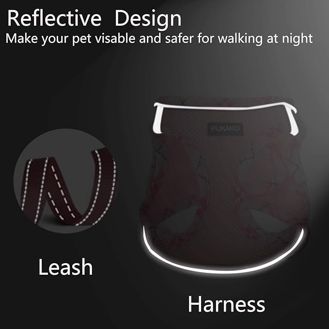 - 【Safety & Reflective】The puppy harness and leash set features high-quality reflective strips and four reflective bands on the sides for enhanced visibility and safety. The vest-style design distributes pulling pressure evenly across the shoulders and chest, applying uniform force and reducing the risk of chafing or choking.