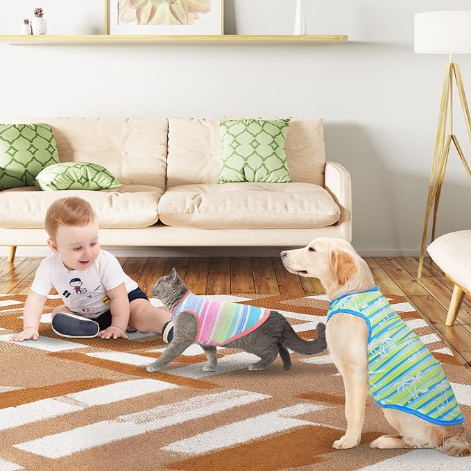 - 【Versatile Pack of 4】The package includes four different designs, giving you a variety of stylish options to dress your pet in while ensuring they stay cool. Dog tank top featuring ocean sailboat, beach coconut, colorful stripe, and starfish patterns, making your pets look unique and charming during the summer season.