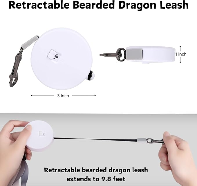 - Upgraded Retractable Lizard Leash: Comes with a 9.8 ft retractable leash with tough nylon tape & rust-proof swivel hook.360°hook and easy-adjust retraction design help you easily adjust the distance while walking.The length of the rope can be adjusted freely, allowing you to keep an ideal distance from your lizard.Push the button to pull back the rope smoothly and not easy to tangle.