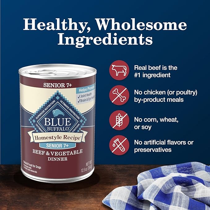 - Contains: Twelve (1) 12.5-oz cans of BLUE Homestyle Recipe Natural Senior Wet Dog Food, Beef Dinner with Garden Vegetables