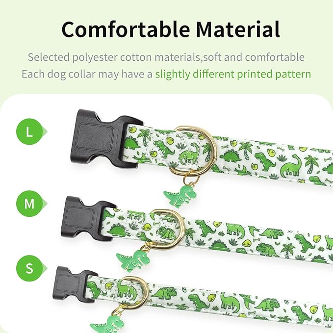 - 【Unique Design】:The special design puppy collar is printed with dinosaur patterns and cute pendant,suitable for all breeds, boys, girls, males and females. The collar make your dogs look stylish, adorable and elegant while travelling, daily walking.