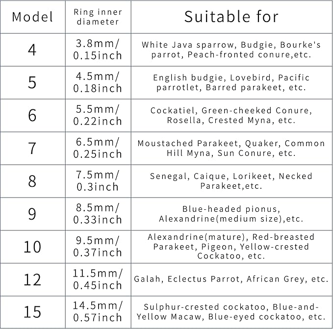 - [Widely Used]Suitable for various large parrots, such as Budgie, Lovebird, Green Cheek Conure, Cockatiel, Sun Conure, Quaker, Necked Parakeet, Senegal Parrot, Hahn’s Macaw, Lorikeet, Caique, African Grey, Cockatoo, Macaw, Eclectus, Galah and etc.Please refer to the size chart provided by us.