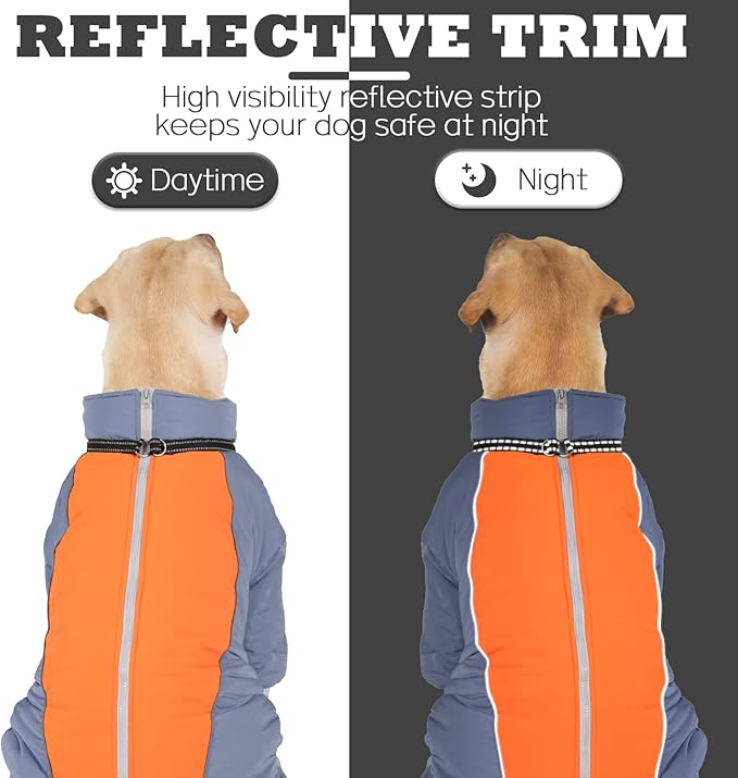 - ❆Reflective Stripes for Safety❆--With reflective stripes detailing on the back and neck, these doggie winter snowsuits ensure your furry friends highly visible in day and night strolls and help to avoid an accident. Bright color lets you never lost sight of your pets. Suitable for small, medium and large size dogs for daily jogging, walking, strolling, running, hiking, skijoring and other outdoor activities in harsh winter.