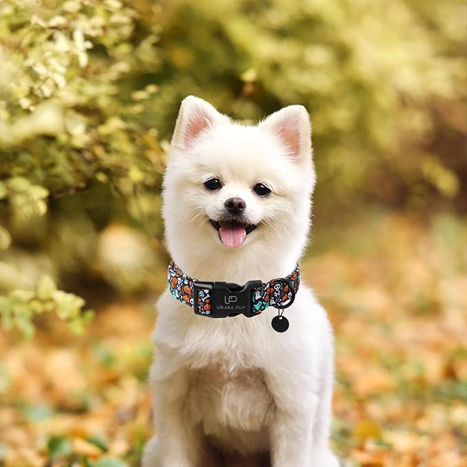 Halloween Dog Collar, UP URARA PUP Cotton Skull Ghost Dog Collar for Small Dog, Fall Pet Collar with Halloween Elements Pattern, Adjustable Puppy Collar,L