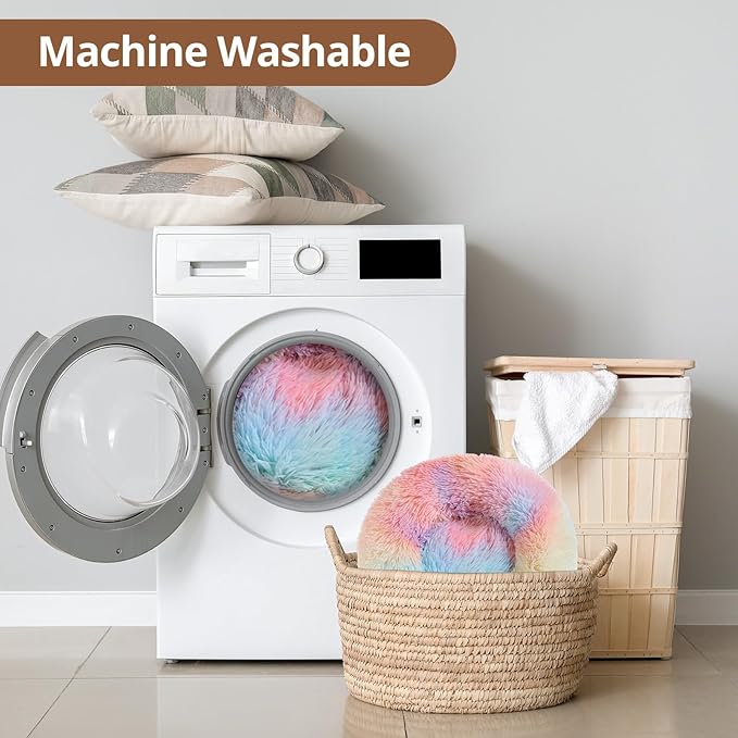 JOLLYVOGUE Calming Dog & Cat Bed for Small Dogs, Anti-Anxiety Donut Cuddler Cozy Soft Round Bed with Anti-Slip Bottom, Fluffy Faux Fur Plush Cushion Beds for Small Medium Dogs, 23"/Rainbow