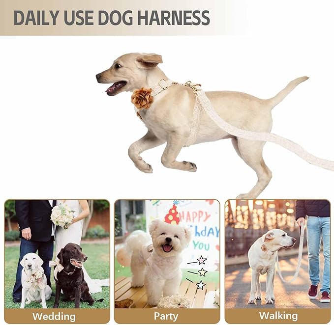Extra Large Dog Harness and Leash Set, Elegant Lace Embroidered Costume, No Pull, Adjustable, White, S/M/L, Dog Wedding Harness, Costume, Pet Outfit