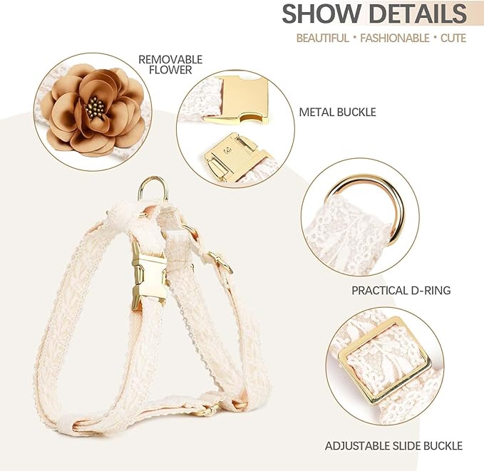 - Exquisite Fashion Adjustable White Dog Harness: The cute dog harness for female dogs is made of cotton fabric, suitable for all seasons. The dog harness with handle for large dogs outer layer is made of exquisite handmade lace, and the inner layer is thick cotton webbing. This no pull harness for large dogs sealed edges and soft touch provide great comfort and are friendly to your pet's skin