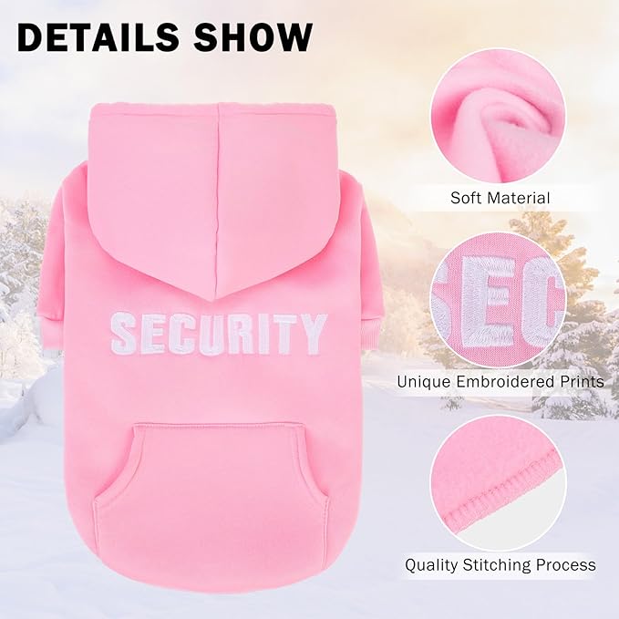- NOVEL AND FASHIONABLE: The dog hooded sweatshirt has a unique "SECURITY" pattern embroidered on the back, which is well-made and gives the whole garment a texture. Wearing it, your dog will be more eye-catching and interesting among his companions, like a policeman in bulletproof underwear.