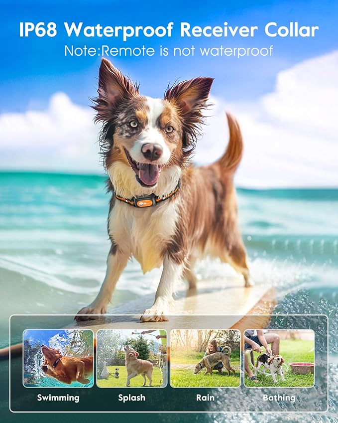 - 【IP68 waterproof and adjustable electronic trainer collar】The shock collar receiver is IP68 waterproof which offers your dogs maximum flexibility during outdoor activities. Size adjustable collar strap, length from 8 to 26 inches, fits dogs from 8 to 140 lbs.Dog training collar is the essential solution to all your dog training needs
