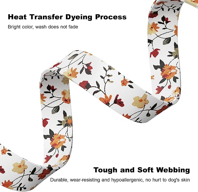 - 【Newest Pattern Design!】 Floral dog collar is designed by a French senior designer based on the popular elements of the season,and uses the newest thermal sublimation transfer process to specifically solve the problem of washing and sun fading.The clear and vivid flower pattern on the collar instantly make the dog elegant,suitable for all female,girls,male and boys dogs.Fashion cutting edge design of the flower dog collar is very beautiful and cute,make your dog stand out from other pets.