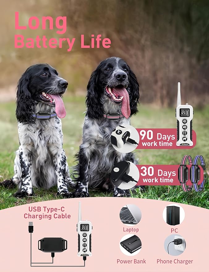 - 【 Long-lasting Battery Life 】 Our vibrating dog collar boasts rapid charging technology that delivers a full charge in just 2 hours. Once charged, the receiver can operate for up to 30 days, and the remote control can last an impressive 90 days. This means less downtime and more convenience for you and your small puppy medium dogs