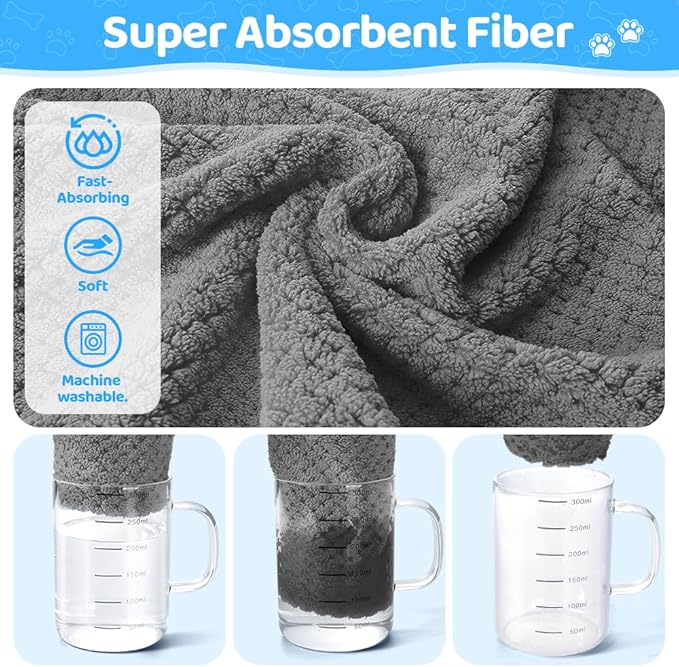 - Ultra-Absorbent Fiber --- Crafted from soft and thick absorbent fiber, the dog bathrobe offers exceptional moisture-wicking capabilities. Machine washable and hand washable, it’s easy to maintain (do not bleach, iron, or dry clean).