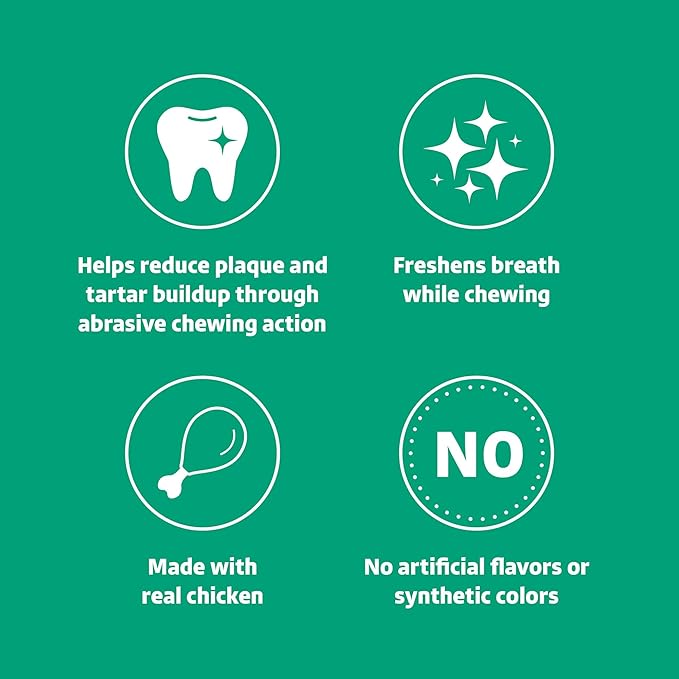 - Minty Fresh Dental Care - Each treat meets your dog’s chewing needs while promoting daily dental hygiene, now with a burst of fresh mint to enhance breath freshness alongside the benefits of real chicken flavor