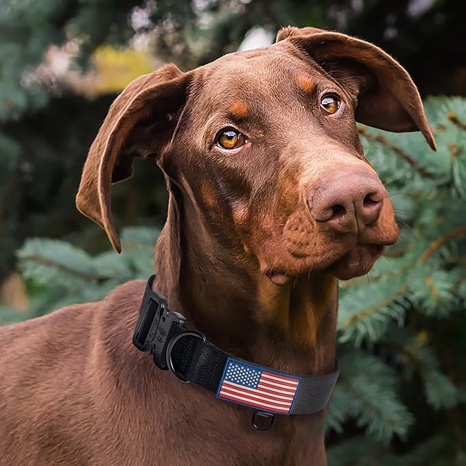 KCUCOP Heavy Duty Dog Collar - Adjustable Tactical Military Dog Collars with Metal Buckle, Quick Release, 2 D-Rings & Flag Patch for Medium & Large Dogs(Black-M)