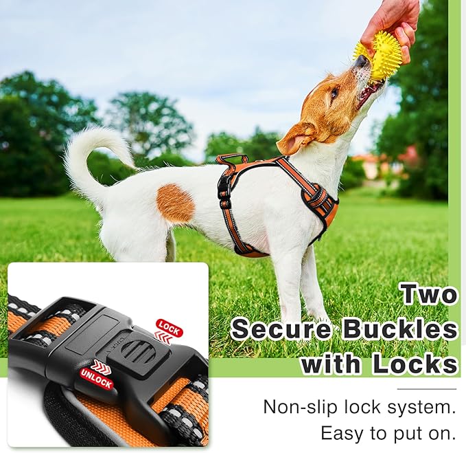 - 【Easy to Use】This dog vest harness designed with quick snap buckles& safe lock, make it easy and secure to put on and take off. This no pull dog harness is made with enhanced 1680D oxford fabric with high density to prevent from chewing or tearing up. Breathable mesh lining with soft sponge padding plate of this dog harness providing extra comfort and protection.