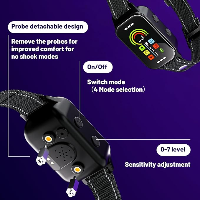 - 【Easy operation &Long Lasting】featuring just two buttons: the on/off button, which controls both the power switch and sensitivity, and the mode button, which controls four different dog training modes. IP67 rating, ensuring its resistance to both water and dust, making it suitable for various environments