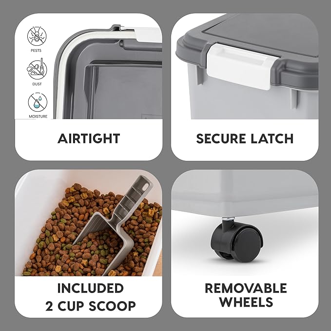 IRIS USA Dog Food Storage Container, 30 lbs & 11 lbs Combo, Cat Food Storage Container, Dog Treat Container, Airtight, Stackable, 2-Cup Scoop, Wheels, Easy Mobility, Gray