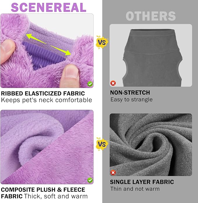 - DOUBLE-SIDED FLEECE MATERIAL: The composite fabric of polar fleece and shaker fleece makes our pet clothes soft and cozy to touch. The fabric is stretchy to accommodate unique body shapes, ensuring your furry friend stays cozy. Provide your dog with some warmth in cold weather