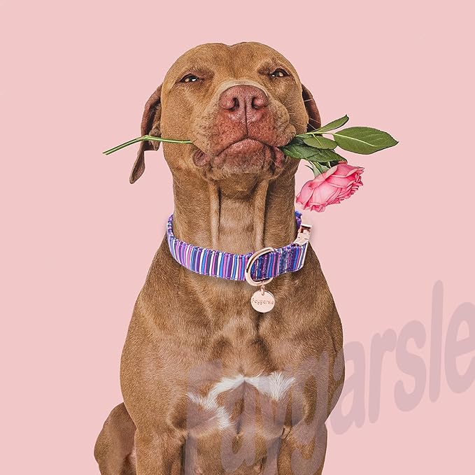 - Vibrant Design: This eye-catching dog collar features a colorful striped pattern with shades of purple, blue, and white.