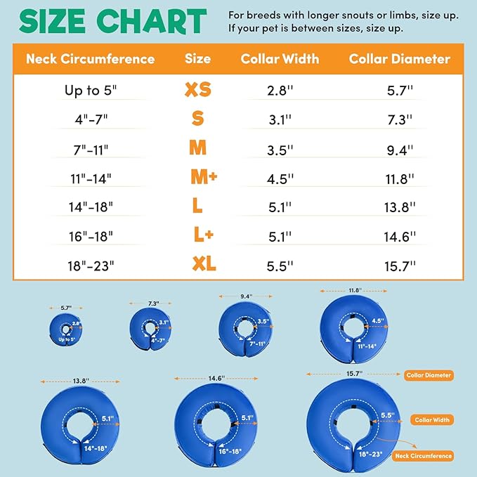 - ADJUSTABLE AND EASY STORING - You can easily adjust the collar strap for a perfect fit and put the strap side at the back of your dog’s neck in case of biting. Deflating and storing is also handy, store it in a small space for space-saving, and there is a zipper opening on one side, you can take the bag out and wash the outside cloth.