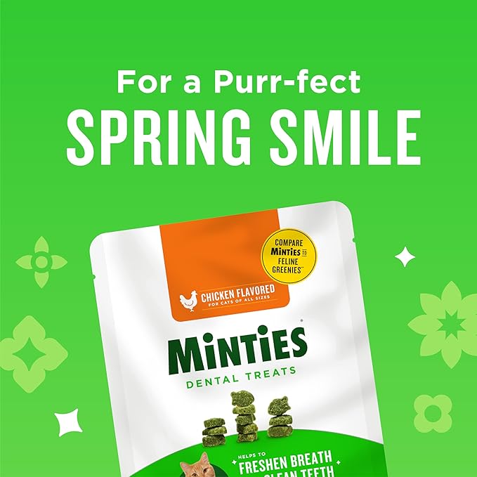- Freshens breath: Minties Dental Treats for Cats is a tasty cat teeth cleaning treat which contains a natural breath freshener that combats bad breath at its source.