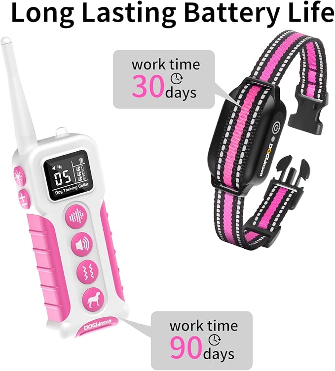 - Long-lasting Battery Life : This no shock training collar for dogs features rapid charging, reaching a full charge in just 2 hours. Once charged, the receiver operates for up to 30 days, and the remote control lasts for up to 90 days