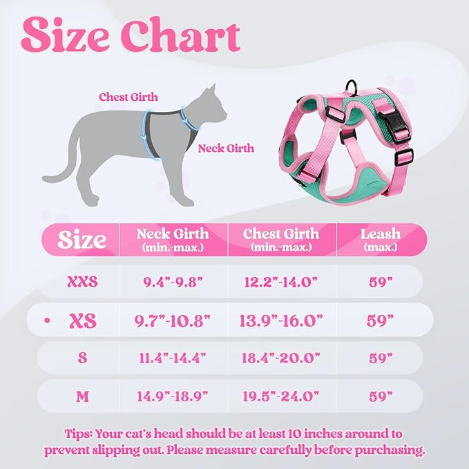 - Various Sizes and Colors for Choice: Size Information-XS( Neck Girth: 9.7"-10.8", Chest Girth: 13.9"-16.0"). Our cat harnesses come in 4 sizes and multiple vibrant dopamine colors. Please measure your cat and check our size chart before purchasing