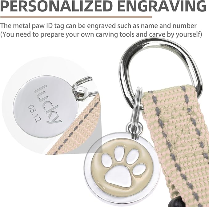 - [Cute ID Tag for DIY] - Each harness is equipped with a metal ID tag, and the front is a cute paw pattern, while on the back, you can engrave whatever you want, such as the dog's name and so on. It does not corrode as easily as wooden labels and is durable. You can also remove it when washing the harness.