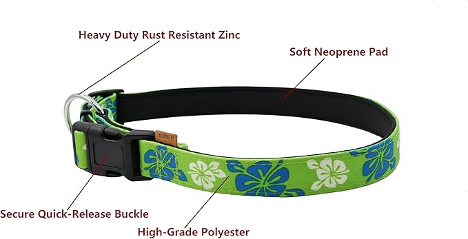 Dog Collar, Cute Floral Pattern, Neoprene Padded and Adjustable Collar with Quick Release Buckle, Reinforced Structure (L (Neck 18-28", Width 1"), Hawaiian Green)
