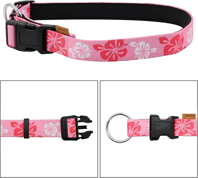 Dog Collar, Cute Floral Pattern, Neoprene Padded and Adjustable Collar with Quick Release Buckle, Reinforced Structure (L (Neck 18-28", Width 1"), Hawaiian Pink)