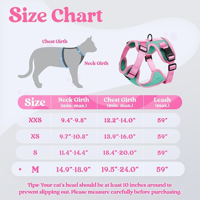 - Various Sizes and Colors for Choice: Size Information-M( Neck Girth: 14.9"-18.9", Chest Girth: 19.5"-24.0"). Our cat harnesses come in 4 sizes and multiple vibrant dopamine colors. Please measure your cat and check our size chart before purchasing. If between sizes, choose the larger size