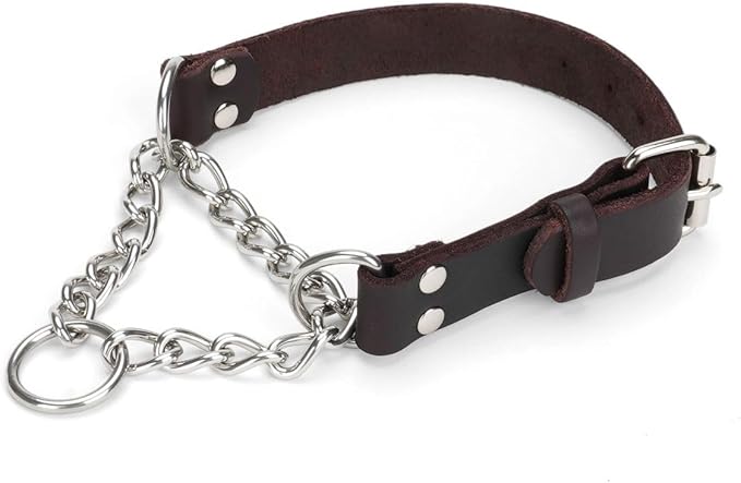 Martingale Collar for Dogs No-Pull Adjustable Training Collar with Stainless Steel Chain - Genuine Leather Anti-Slip Design for Small,Medium,Large Breed Dogs - Brown (L)