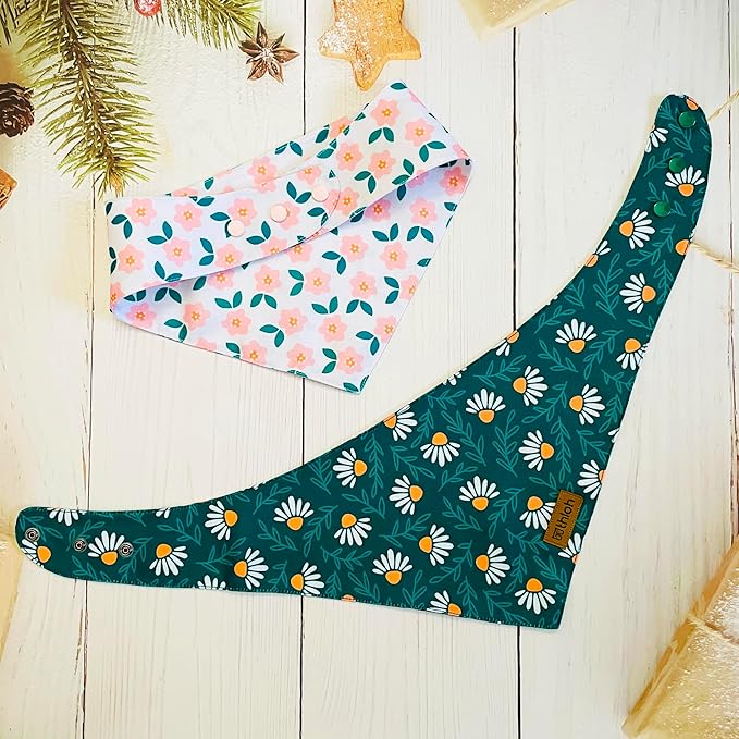 Spring Dog Bandanas with Snap Button, 2 Pack Floral Dog Scarf for Boy & Girl, Durable Fabric, Adjustable Fit, Unique Shape, Gift for Dogs, Daisy Bandana for Large and Extra Large Dogs (X-Large)