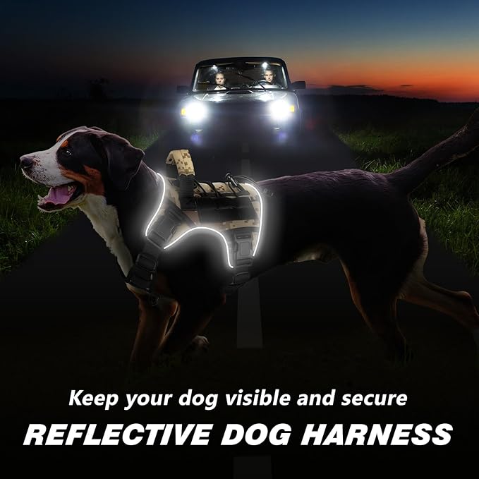 - Military-standard Materials: Extra large tactical dog harness is made of military nylon and adopts an upper and lower two-layer structure. The outer camouflage pattern is 1000D nylon with sturdy stitching for extra durability, and the inner layer is a mesh material with excellent breathable, comfortable fit and no harm to the dog