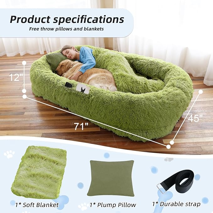Human Dog Bed, 71''x45''x12'' Size Fits You and Pets, Washable Faux Fur Dog Bed for People Doze Off, Napping Orthopedic Dog Bed, Present Plump Pillow, Blanket, Strap - GrassGreen