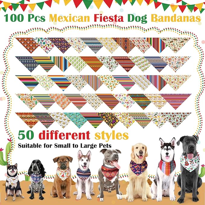 - Mexican Dog Bandanas Bulk: you will receive 100 bulk Fiesta dog bandanas with 50 different styles to choose from; Rich colors and various patterns; Sufficient quantities of triangle bibs for dogs can meet the daily replacement and matching of pets, and dress up your pets in various styles according to your preferences