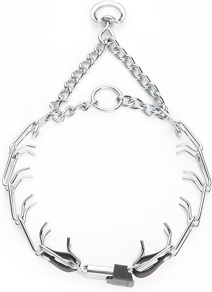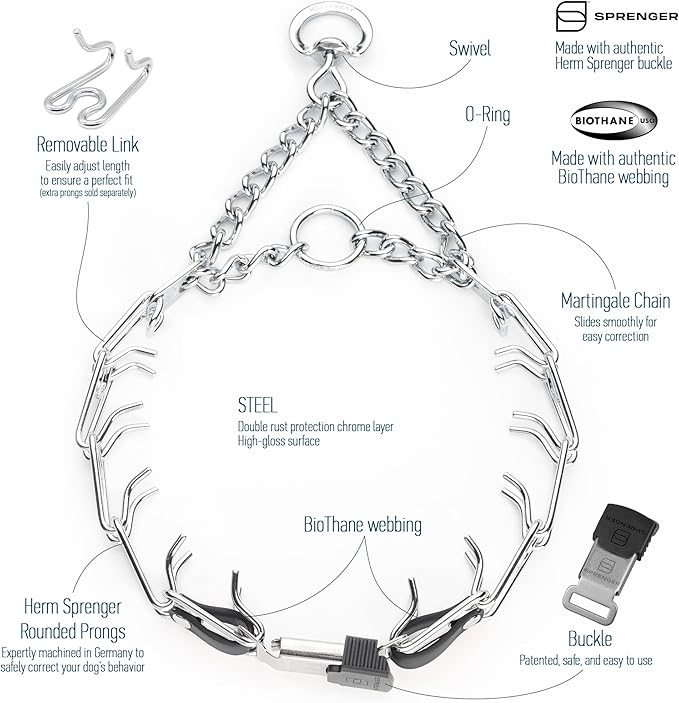 - Herm Sprenger Chrome Plated Steel Prong Collar: This training prong dog collar features a Herm Sprenger Click Lock Buckle, Swivel D-Ring and U.S. made Biothane insert; The Biothane insert enhances the stability and security of the buckle connection with the prongs, while adding a personalized touch with a choice of different colors