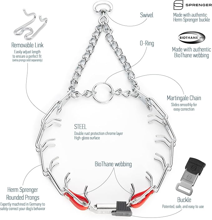 - Herm Sprenger Chrome Plated Steel Prong Collar: This training prong dog collar features a Herm Sprenger Click Lock Buckle, Swivel D-Ring and U.S. made Biothane insert; The Biothane insert enhances the stability and security of the buckle connection with the prongs, while adding a personalized touch with a choice of different colors