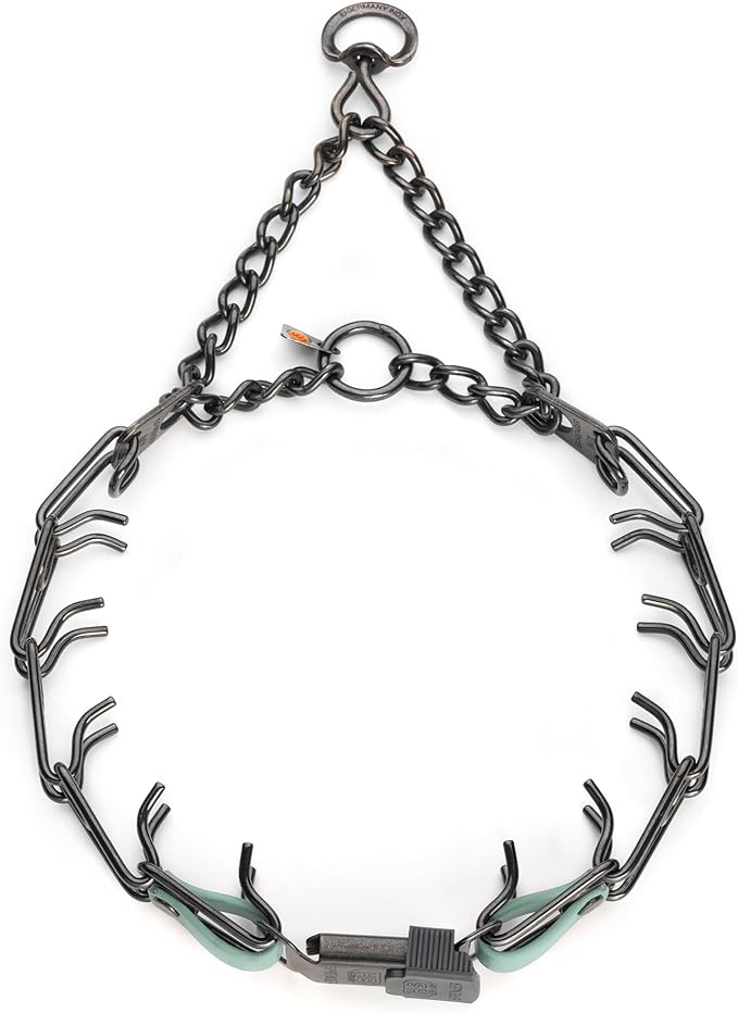 - Herm Sprenger Black Stainless Steel Prong Collar: This training prong dog collar features a Herm Sprenger Click Lock Buckle, Swivel D-Ring and U.S. made Biothane insert; The Biothane insert enhances the stability and security of the buckle connection with the prongs, while adding a personalized touch with a choice of different colors