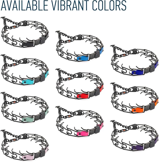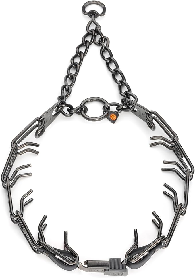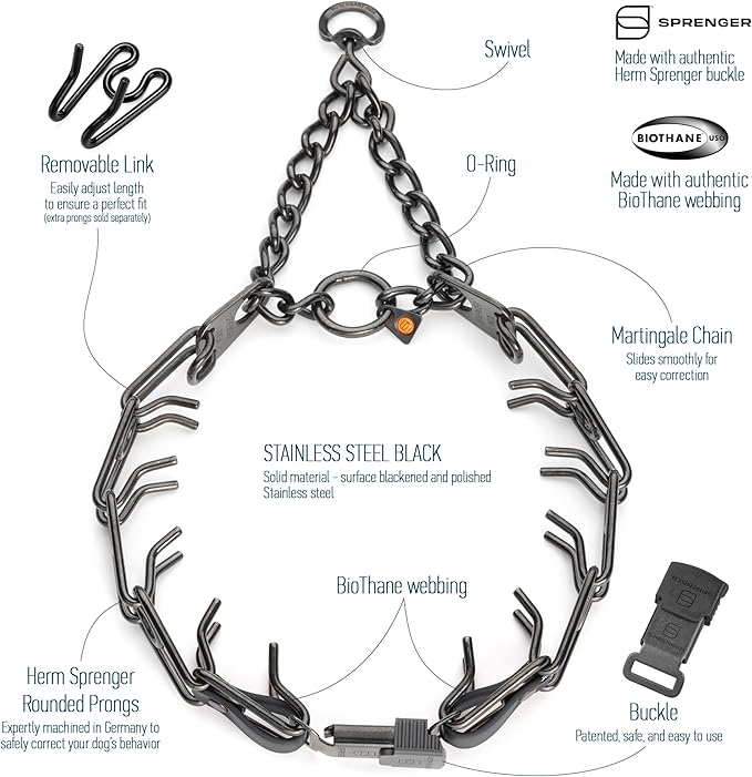- Herm Sprenger Black Stainless Steel Prong Collar: This training prong dog collar features a Herm Sprenger Click Lock Buckle, Swivel D-Ring and U.S. made Biothane insert; The Biothane insert enhances the stability and security of the buckle connection with the prongs, while adding a personalized touch with a choice of different colors