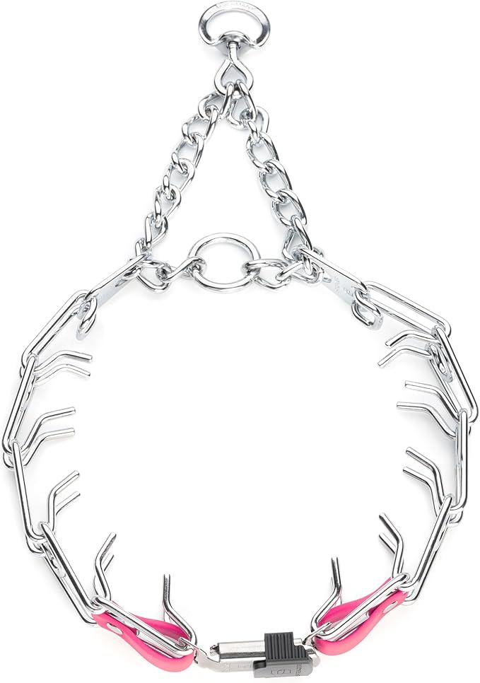 - Herm Sprenger Chrome Plated Steel Prong Collar: This training prong dog collar features a Herm Sprenger Click Lock Buckle, Swivel D-Ring and U.S. made Biothane insert; The Biothane insert enhances the stability and security of the buckle connection with the prongs, while adding a personalized touch with a choice of different colors