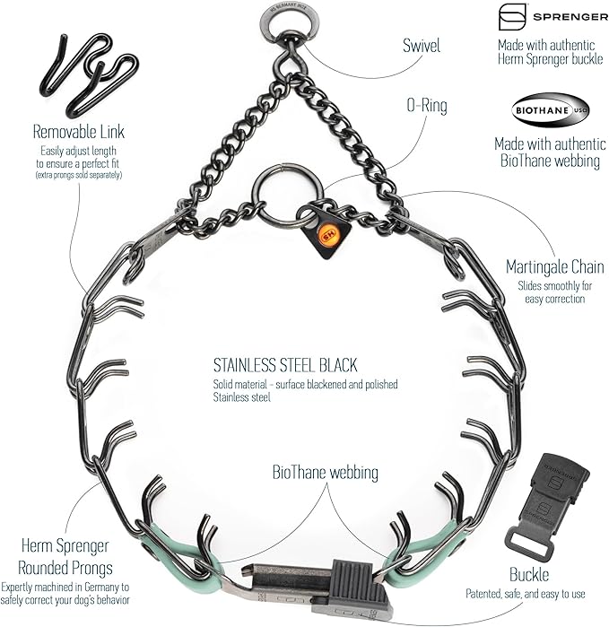 - Herm Sprenger Black Stainless Steel Prong Collar: This training prong dog collar features a Herm Sprenger Click Lock Buckle, Swivel D-Ring and U.S. made Biothane insert; The Biothane insert enhances the stability and security of the buckle connection with the prongs, while adding a personalized touch with a choice of different colors