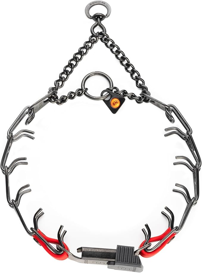 - Herm Sprenger Black Stainless Steel Prong Collar: This training prong dog collar features a Herm Sprenger Click Lock Buckle, Swivel D-Ring and U.S. made Biothane insert; The Biothane insert enhances the stability and security of the buckle connection with the prongs, while adding a personalized touch with a choice of different colors