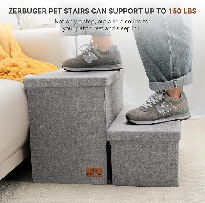 - MORE STABLE AND COZY: Zerbuger dog stairs are made of MDF and include foam, which relieves pressure on pets' paws and joints. Our pet steps are perfect as a warm GIFT for you hurt, disabled and elderly dogs. The removable board pads are placed inside to ensure that the pet steps are stable enough without any wobbling. The non-slip bottom ensures that the pet steps don't move. The dog stairs can support up to 150 LBS.