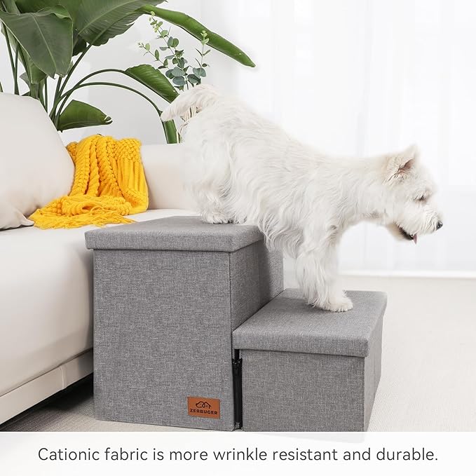 - 2-IN-1 DOG STAIRS WITH STORAGE: Zerbuger pet stairs not only provide a stable and cozy stair for your pet to climb, but also serve as a convenient large storage area total of 54QT for your pet's clothes, toys, or any other supplies. Our pet steps are covered with removable lids, Every steps are designed as storage boxes.